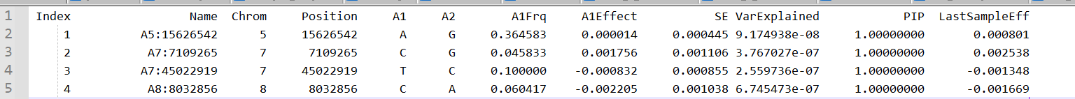 这里重点结果文件就是 test.snpRes ,重点在于第2列(Name, 即SNP名称),第5列(A1),第8列(A1Effect, SNP的效应大小)。
