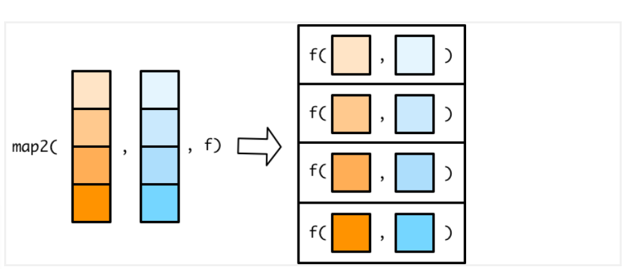 • map()map2()函数,指定传递给函数f的向量,向量各自放在各自的位置上