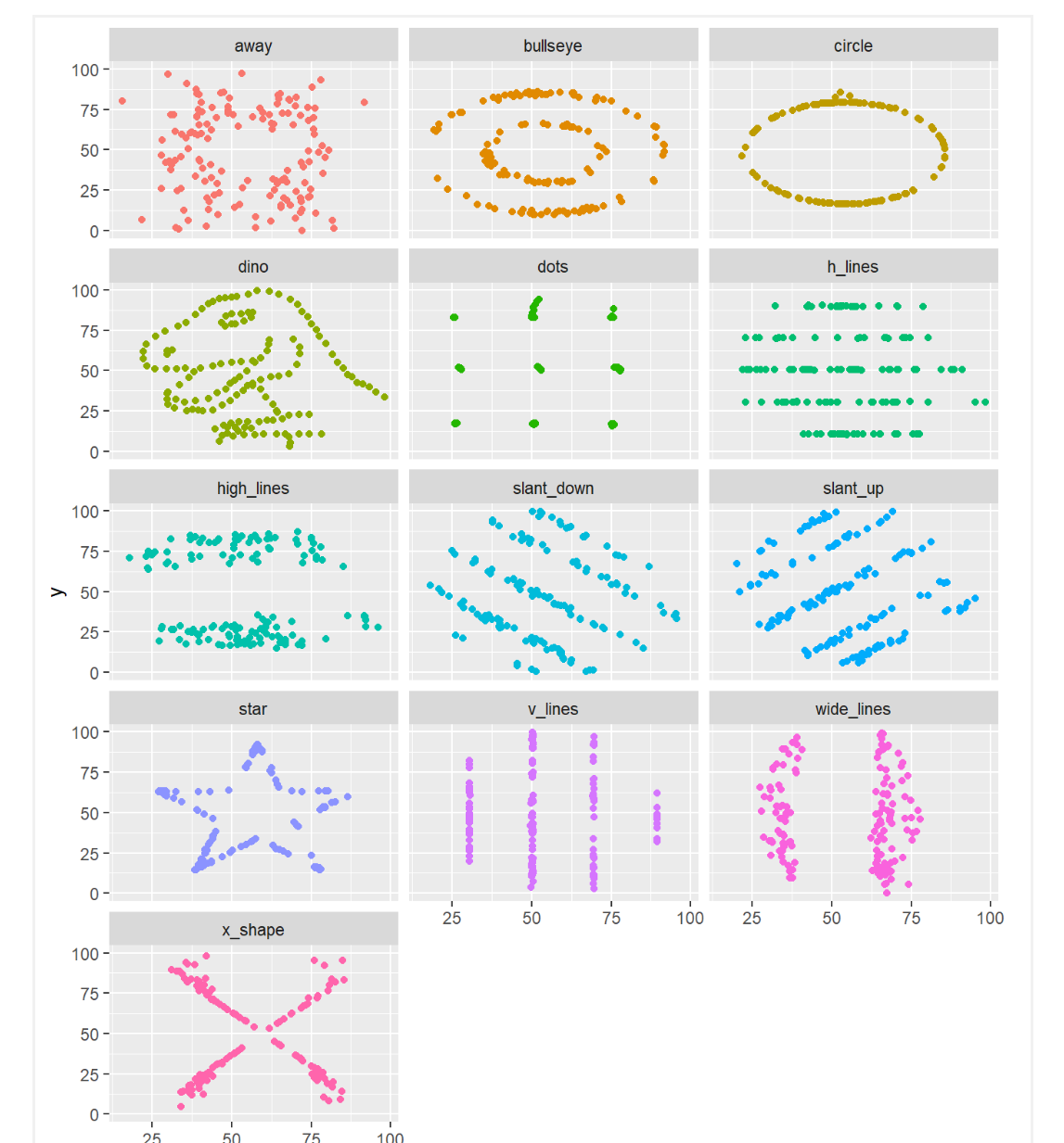 先用dataset分组后,然后计算每组下x的均值和方差,y的均值和方差,以及x,y两者的相关系数,我们发现每组数据下它们几乎都是相等的