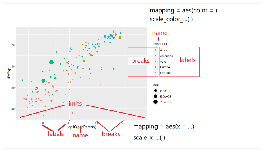 • 参数limits, 坐标或图例的范围区间。连续性c(n, m),离散型c("a", "b", "c")