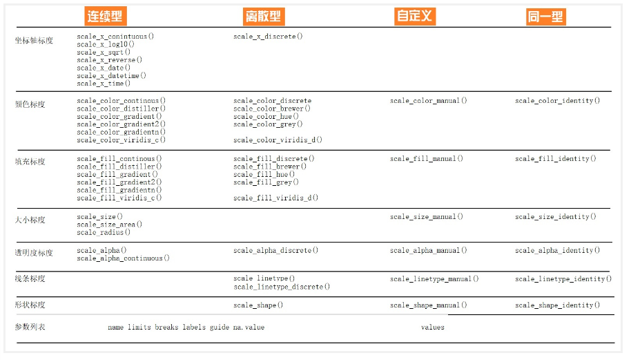 22章,我们了解到ggplot2中,映射是数据转化到图形属性,这里的图形属性是指视觉可以感知的东西,比如大小,形状,颜色和位置等。我们今天讨论的标度(scale)是控制着数据到图形属性映射的函数,每一种标度都是从数据空间的某个区域(标度的定义域)到图形属性空间的某个区域(标度的值域)的一个函数。