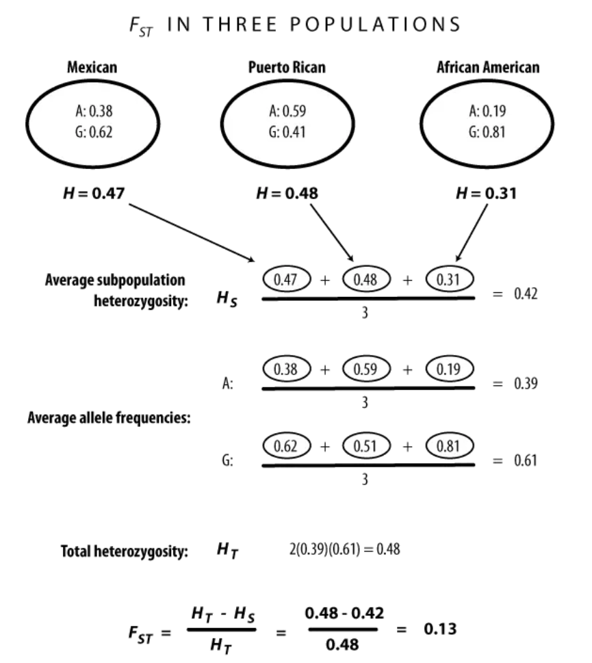 基于 https://www.jianshu.com/p/bb0beec0ed63 ,计算 FST 只需要每个群体的基因频率就能计算(但我看不同网页的计算方法还是有区别,而且貌似这样手动计算的结果和软件结果并不一致)